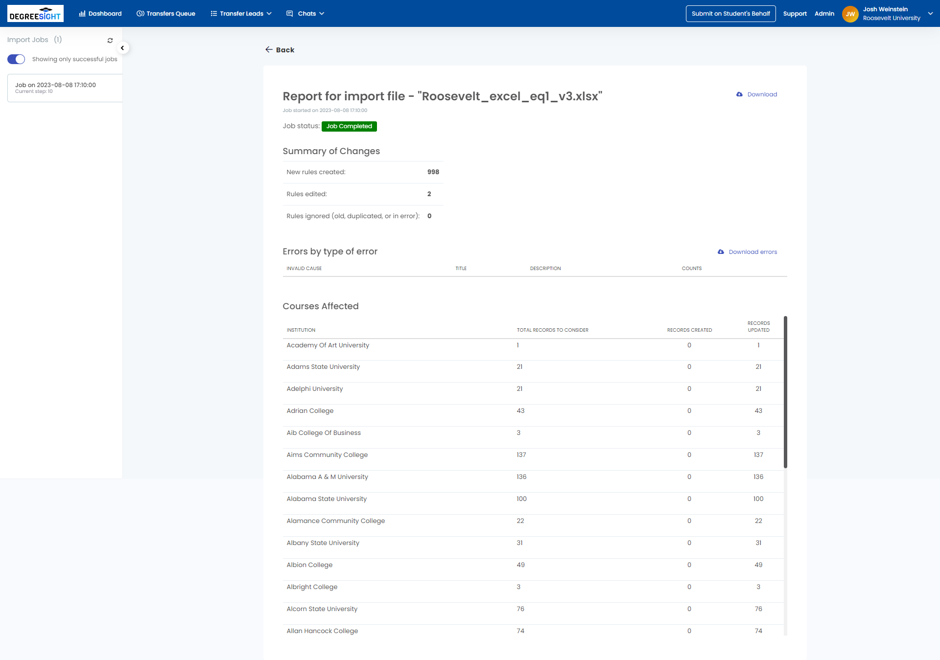The Import Logs can be used to review previously imported equivalency data files: