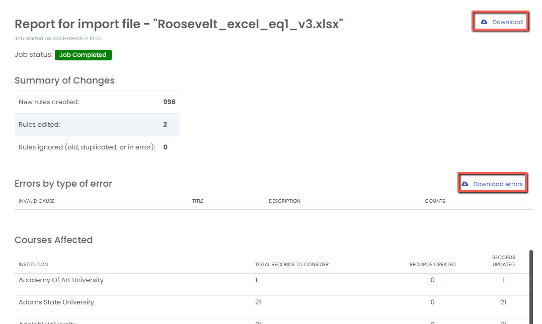 You can click the "Download" or "Download Errors" links to download the imported file/error report: